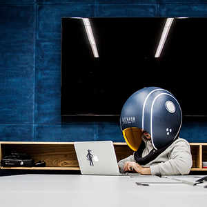 比起降噪耳机,helmfon 头盔能更彻底地隔绝外部噪音,而且头盔的设计让使用者的视线也只能集中到眼前的电脑上,从而更能专注于眼前的工作。