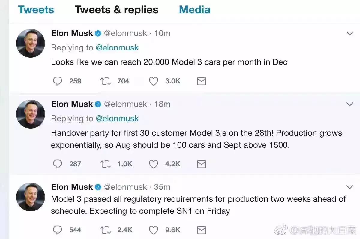 同时,在随后更新两条的Twitter中马斯克公布了model 3量产情况,马斯克称,“在本月28日特斯拉将举行一场交车仪式,届时首批30辆Model 3将正式交付车主。到今年8月份预计交付100辆新车,9月这一数字将升至1500辆。到12月份,产能就将稳定到每月2万辆。”