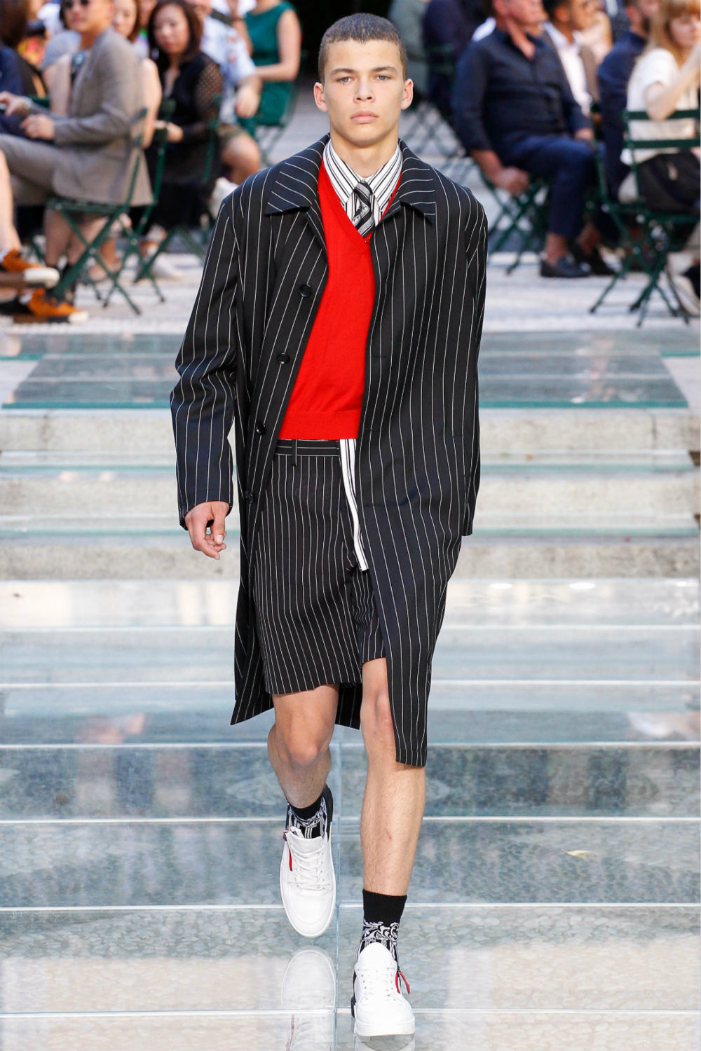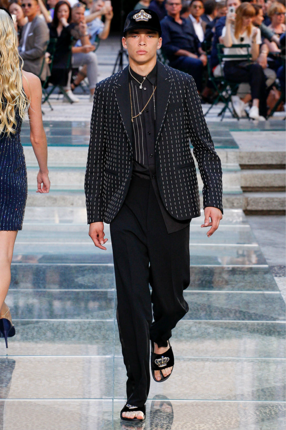 两周以前的2018春夏米兰男装周上,Versace回归品牌总部,在米兰Palazzo Versace举办了最新发布会。时间节点适逢创始人Gianni Versace逝世20周年,宽版条纹西装、休闲短裤、标志性的图腾丝巾......一切仿佛都回到了30多年前Versace的黄金岁月。