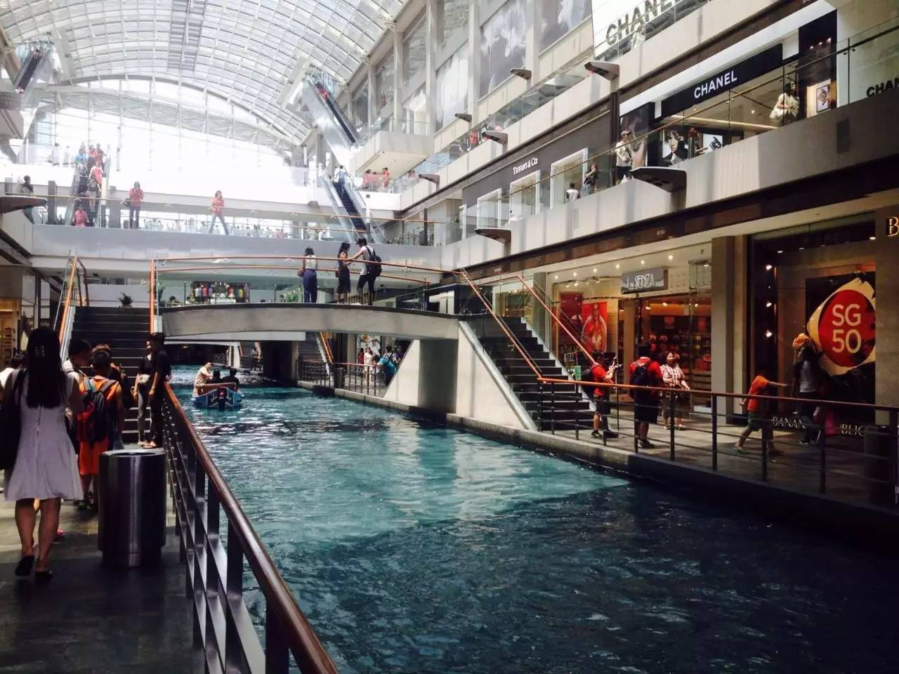 金沙购物广场的另一个特色,是它的室内运河。运河两岸是琳琅满目的购物商店,游客们可以坐在游船上,以不一样的视角在各色奢侈品牌中穿梭。