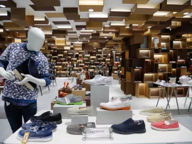 不同色度的咖啡色木盒子,让男装区的鞋包的陈列融为一体;