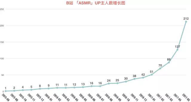 通过技术爬虫发现,2016年6月以前B站仅有10名UP主(B站内对于视频上传人员的称呼)上传30条标题中包含ASMR的视频。而6月至12月则出现111条相关视频上传,UP主的人数也增至35名,2017年至今UP主人数达到212名。