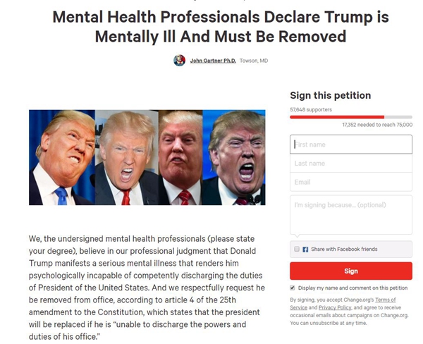 今年初,心理医生加特纳(John Gartner)在网上发起请愿,表示心理学专业人士认为特朗普有心理疾病,不能担任总统一职。截至目前,这个请愿收集了5.7万多个签名。