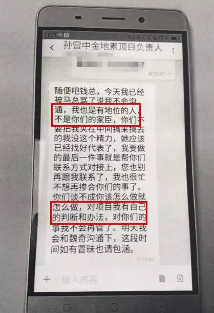 过会后,钱维发现孙雷的态度判若两人。孙雷在短信中称:“我也是有地位的人,不是你们的家臣”,表示自己将不再参与协商,并补充“对项目我有自己的判断和办法”。