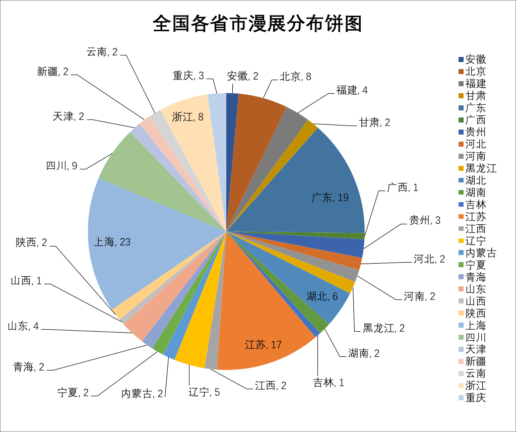 在下面这张图表中,你可以看到这次调查中全国各省市漫展分布情况: