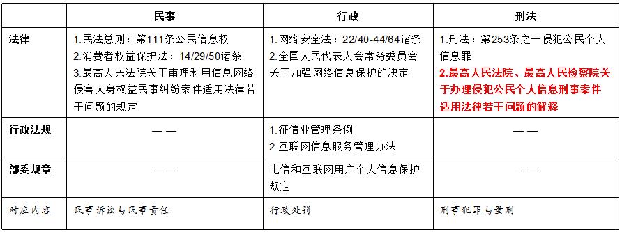 个人信息关乎其人身、财产安全,互联网时代甚至还可能波及区域性社会稳定,因此国家历来重视从立法层面进行保护。截至目前,形成了横向有“民事-行政-刑法”、纵向有“法律-行政法规-政府规章”的监管制度体系: