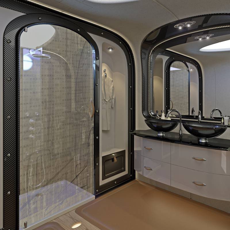 既然是和超跑合作,那么Pagani最擅长的碳钛合金复合材质必须得有,飞机内部墙壁及家具均采用碳纤维制造,整体风格与Pagani超跑内装的用料及灯光配置相似。