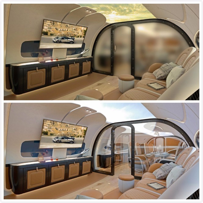 地板则是木制的,上面铺有皮制地毯。客舱内的休息室与会议室之间为透明隔断,按下开关就会变成不透明。