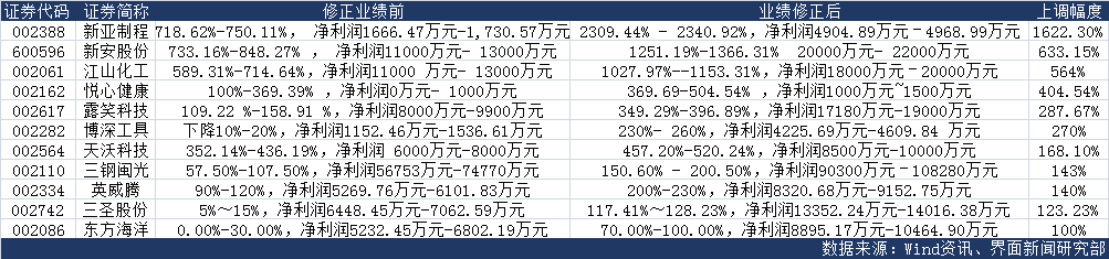 共有11家公司的上调幅度超过100%。其中新亚制程(002388.SZ)增幅超16倍,位列第一,新安股份(600596.SZ)以超过6倍的增幅紧随其后。
