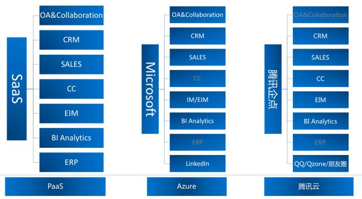 1)微软的企业SaaS服务产品更多是由不同的产品组成,如大家耳熟能详的Office 365,CRM领域有Dynamics,EIM领域有Skype for Business,分析领域有Power BI,而腾讯则通过企点完成UCM的整体布局,覆盖企业外部流程的诸多方面场景。