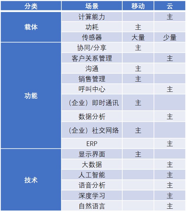 更进一步地,云和移动使解决方案的关键要素出现了场景上的分离,比如性能更多交给计算能力强大的云端交付,而功耗和传感器则在应用端——现在的主要场景是手机端——发挥作用,功耗限制了场景的可用性,传感器为场景提供解决方案提供了充足的数据支撑。