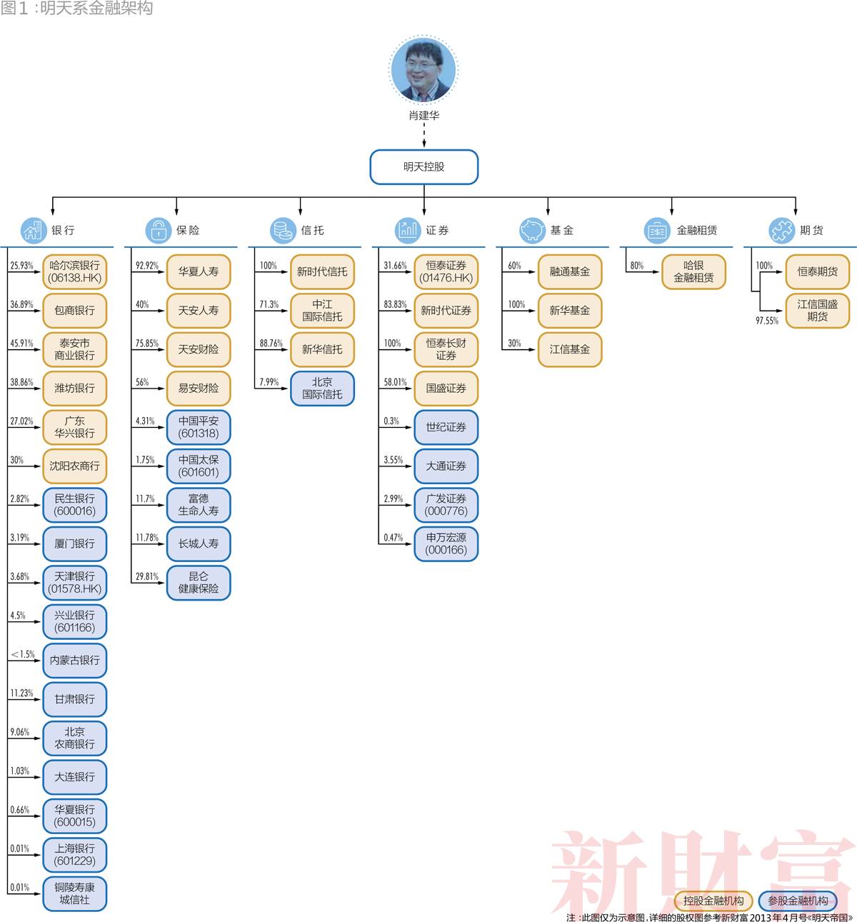 关于明天系的资产版图,新财富曾做过详细拆解(详见新财富2013年4月号《明天帝国》)。当时的调查结果显示,明天系掌控9家上市公司,控股、参股30家金融机构,但由于资料所限,我们不能肯定,“这就是明天系的全貌,没有任何遗漏”。