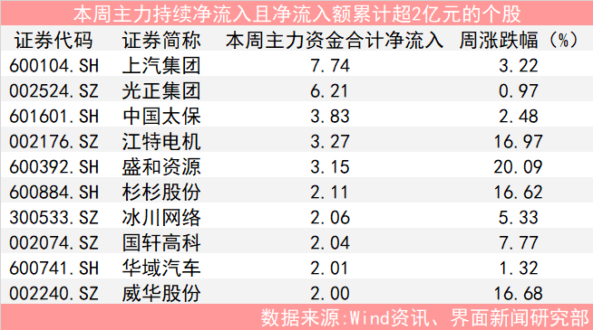 本周主力持续净流入且净流入额累计超2亿元的个股