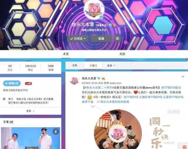 根据这一用户行为习惯的转变,《快乐大本营》也率先通过与用户连接,建立起了自己的品牌社群。比如它通过自己的官方微博发布一些与节目有关的花絮图片等来制造话题。