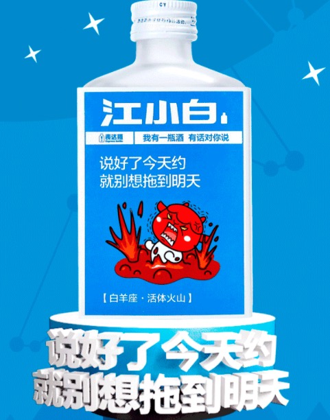 最近他们就与同道大叔联名推出了“十二星座”限量版瓶身,鲜明的蓝白配色上是同道大叔团队绘制的不同星座及匹配文案。比如白羊座的瓶身写着“活体火山”:说好了今天约,就别想拖到明天;而金牛座则是符合大众眼里“会省钱”印象的“爱吃爱钱”:你若发达了,别忘了毕业聚餐时你欠我的老醋花生。似乎是为大学生毕业季聚餐量身定制,在微博反馈中,一些人评价其“有情怀”。