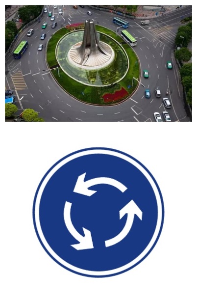 看到这个环岛行驶的标志牌,一定要往右边逆时针行驶,不然就会发生相撞意外的事故。