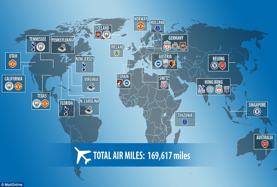 对于商业化程度最高的英超联赛,每年夏天的季前热身赛,通常会成为各支球队拓展海外市场、推广球队品牌、培养海外球迷的绝佳机会,于是英超诸强也都不约而同地飞赴海外拉练,开启他们的一年一度的“淘金”之旅。根据《每日邮报》的统计,今夏20支英超球队的海外飞行全程,更是接近17万英里。