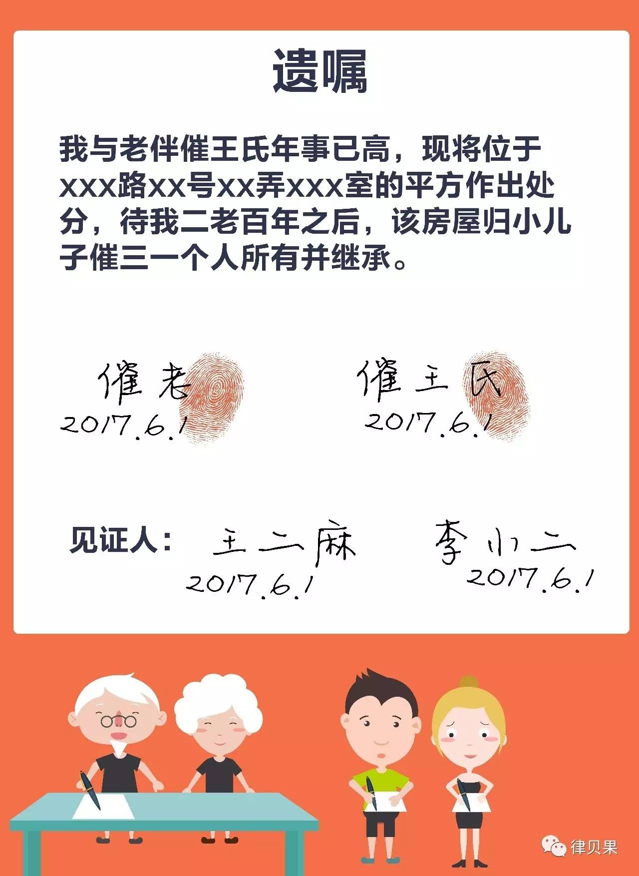 位于靠山屯的平房系我与老伴催王氏的夫妻共同财产,现我和老伴年事已高,为避免我和老伴死后,不孝子之间争夺财产发生流血事件,我决定代表我老伴催王氏立此遗嘱,以上房屋由我小儿子催三一人继承。”该遗嘱落款日期为2017年6月1日,上有催催爷爷签名及指纹一枚,也有奶奶的签名和指纹,遗嘱下方有代书人王二麻和见证人李小二、郑钱的签字及日期。