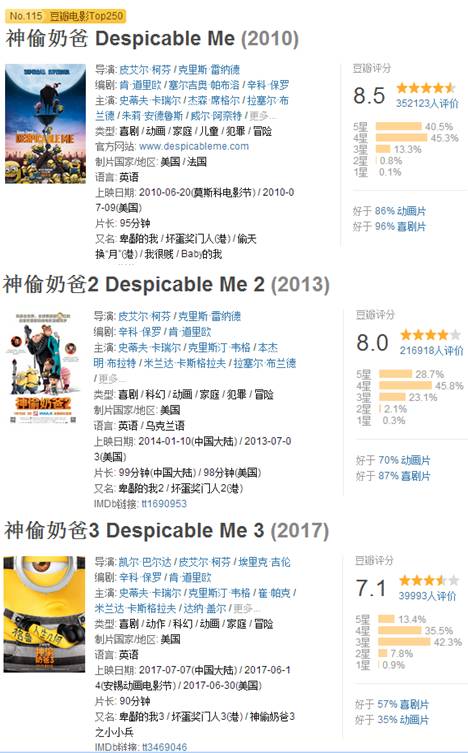 从豆瓣评分来看,《神偷奶爸》第一部高达8.5分,到《神偷奶爸3》时降为7.1分。在海外IMDB获得6.5分,“烂番茄”新鲜度62 %,爆米花指数66%,只能说影片勉强及格。