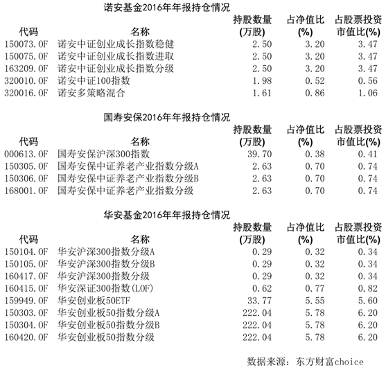 值得注意的是,有三家公司给出四个跌停板的预估,即20.13元,包括华安基金、诺安基金、国寿安保基金。下表为2016年年报中三家公司旗下基金对乐视网的持仓统计: