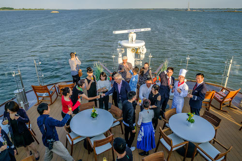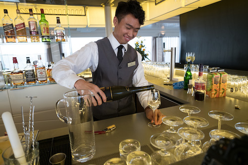 第一天所有客人登船后,船上平均年龄在25岁的年轻中国服务团队就表现出他们结合了东西方文化的服务特色。服务生们会用最快的速度记住每个客人的姓氏与点餐和饮料的偏好。