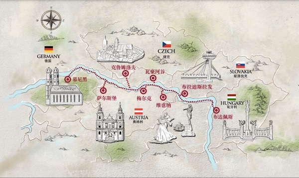 这条11天的多瑙河之旅线路全程途径4个申根国家,从维也纳登船,先向西经奥地利瓦豪河谷驶向多瑙河的上游,到达德国慕尼黑后,再调头一路向东,经奥地利萨尔斯堡、捷克克鲁姆诺夫、奥地利梅尔克以及斯洛伐克的布拉迪斯拉发,最终抵达布达佩斯。