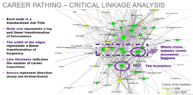 除了总结出以资产组合管理为首的一系列行业关键技能,大数据也通过对13万个职业发展历程样本的数据库分析动态给金融人才提供了未来可能发展道路的动态启示。