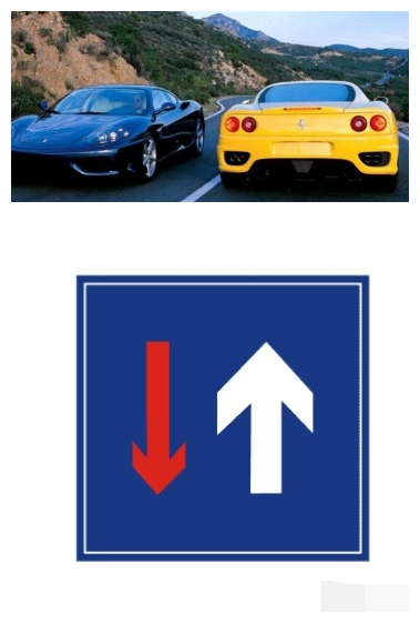 蓝白相间的线框,内框是蓝底色,右边是一个大的白色向上的箭头标志,左边就是一个瘦小红色向下的箭头标志,这是代表会车的意思。