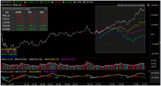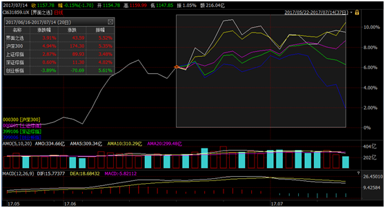 7月14日,界面60投资组合收于1157.78点。界面60投资组合自上期报告日6月16日以来一个月累计上涨3.91%,年化收益率为62.05%。在此区间内,上证50涨幅6.54%,沪深300涨幅为4.94%,跑赢界面60投资组合。上证综指、深证综指及创业板均跑输界面60投资组合,其中创业板跌幅达3.89%。