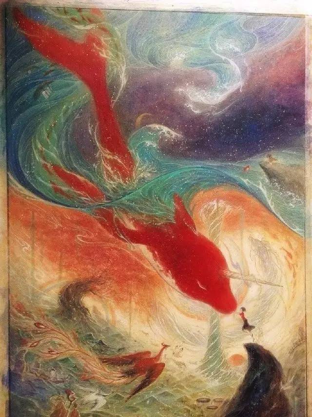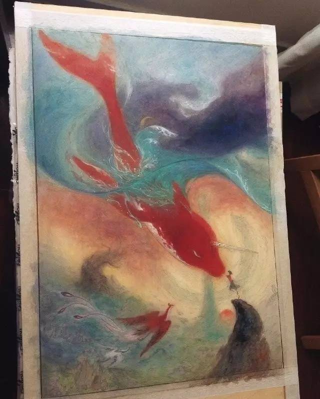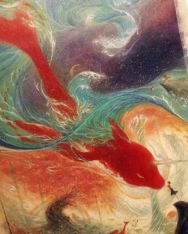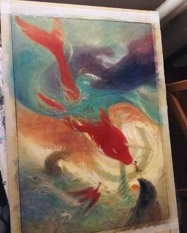 《大鱼海棠》最主要的海报是手绘的,但是由于水彩的特性,干后颜色会变灰,而商业海报需要强烈的色彩对比,所以需要设计师一遍遍薄盖好几层。