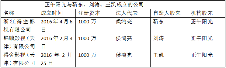 在2016年《欢乐颂》播出之前,正午阳光就已开始在资本层面着手布局,与其影视剧中的“常客”刘涛、王凯、靳东分别合资成立公司,靳东的浙江得空影视有限公司、刘涛的锦麟影视(天津)有限公司、王凯的得舍影视(天津)有限公司,三家公司法人代表均为侯鸿亮,正午阳光以机构入股,占据60%的股份,明星股东占据40%股份。