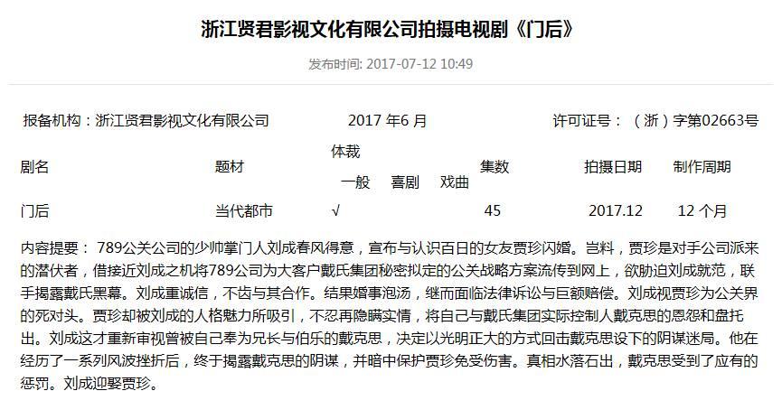 根据网络消息显示,今年靳东在影视剧上的布局同样未曾松懈:4月开机的都市情感大戏《恋爱先生》中贤君影视参与联合出品;而在广电总局公布的2017年6月份电视剧备案显示,贤君影视打算在今年年底开拍年代剧《门后》,预计制作周期为一年时间。