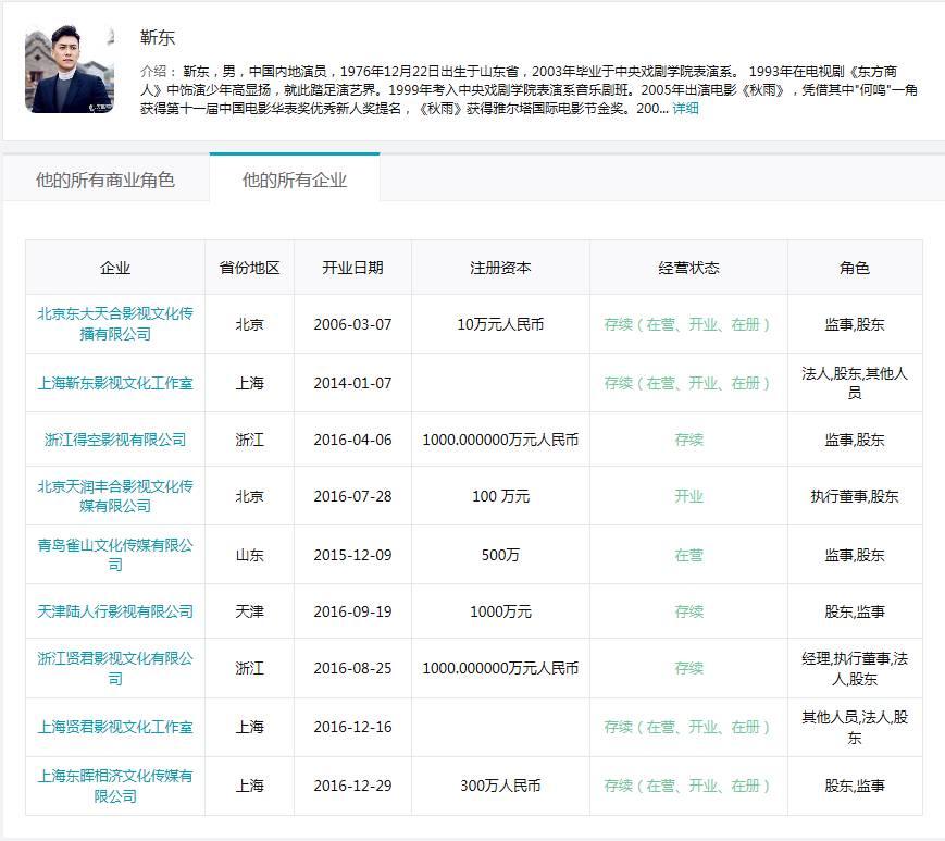 接连三年的佳作加持,靳东的演艺事业迎来了“新春”,但是显然,此时的靳东已经不满足“演员”这一角色,他将目光更多的投向了影视剧的上下游产业链中。根据天眼查资料显示,靳东名下企业或是其参与投资的企业共有9家,除了有一家北京东大天和影视文化传播有限公司早在2006年就已开业、上海靳东影视文化工作室在2014年开业之外,其余企业均是在2015年末及其之后开始布局,不难揣测《伪装者》、《琅琊榜》两部大剧对其事业的影响之大。