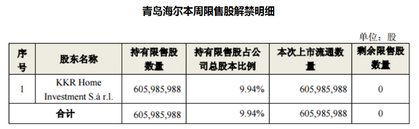 青岛海尔本次解禁涉及股东仅有一家,为KKR Home Investment S.à r.l.(下称KKR(卢森堡))。三年前,KKR(卢森堡)参与了青岛海尔定增,这笔投资也让KKR(卢森堡)赚得盆满钵满。