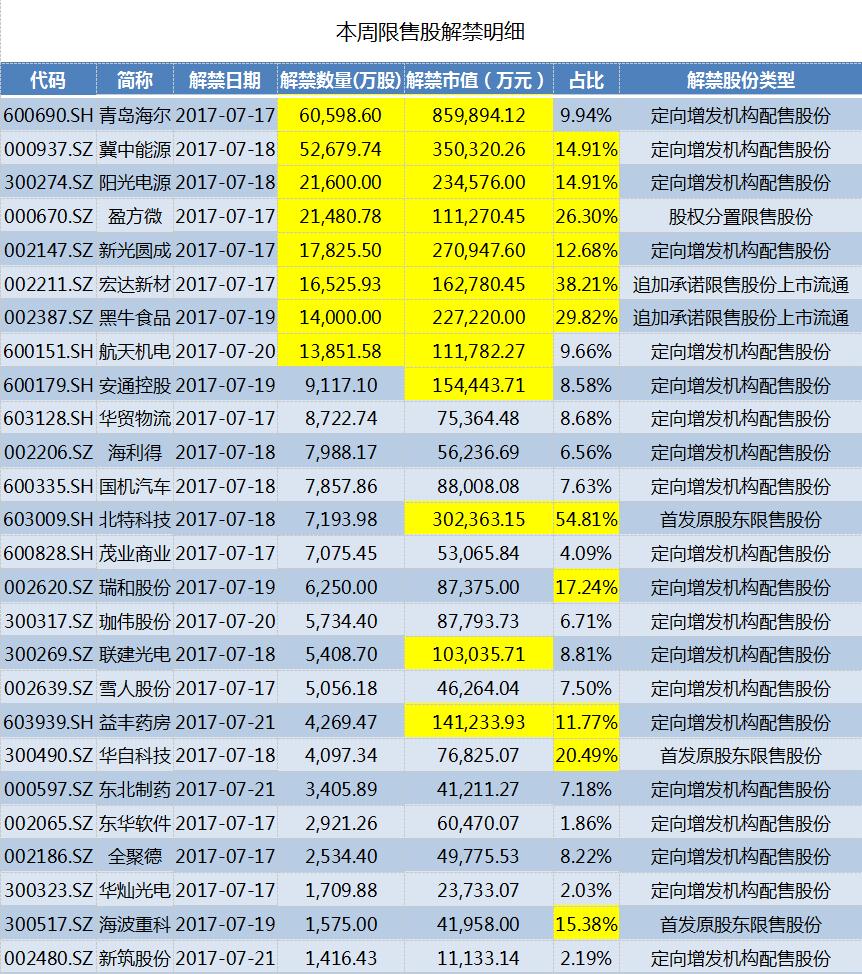 本周解禁股份超过1亿股的上市公司有8家,分别为青岛海尔、冀中能源(000937.SZ)、阳光电源(300274.SZ)、盈方微(000670.SZ)、新光圆成(002147.SZ)、宏达新材(002211.SZ)、黑牛食品(002387.SZ)和航天机电(600151.SH)。