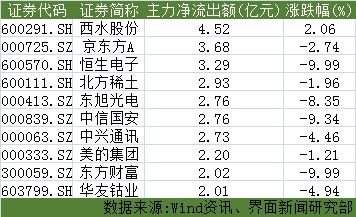 西水股份(600291.SH)、京东方A(000725.SZ)、恒生电子(600570.SH)的主力资金净流出额居两市个股前列,分别为4.52亿元、3.68亿元、3.29亿元。值得注意的是,随着中报行情展开,不少业绩预减的个股遭遇下挫,东方财富(300059.SZ)于近期发布半年度业绩预减公告,今日便遭遇主力抛售,主力净流出2.02亿元,并以跌停报收。