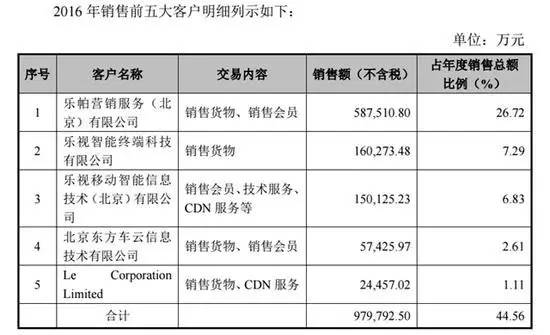 新乐视面临的另一个棘手问题是——乐视网近日公告中暴露出的关联方问题。根据乐视网更正的年报披露,乐视网2016年销售前五大客户均为乐视网关联方,乐视网与这五家公司的关联交易至少为乐视网贡献了44.56%的销售收入,合计97.97亿元。
