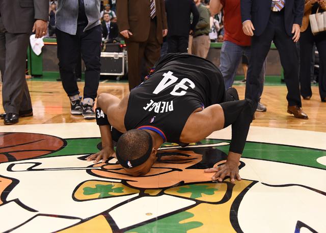 所有关于这场皮尔斯在波士顿的谢幕战的报道,配图都惊人的相似。这也能理解,因为没有什么画面能比亲吻地板更加经典了。