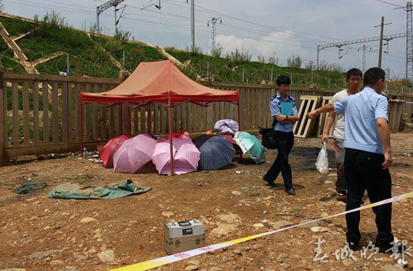 现场拉起了警方的警戒线,围满了村民,大家神色凝重,回忆着昨晚的不幸。角落撑起了一个临时帐篷,几把彩色的雨伞围出相对私密干净的空间,但是也能看到伞下露出的脚。