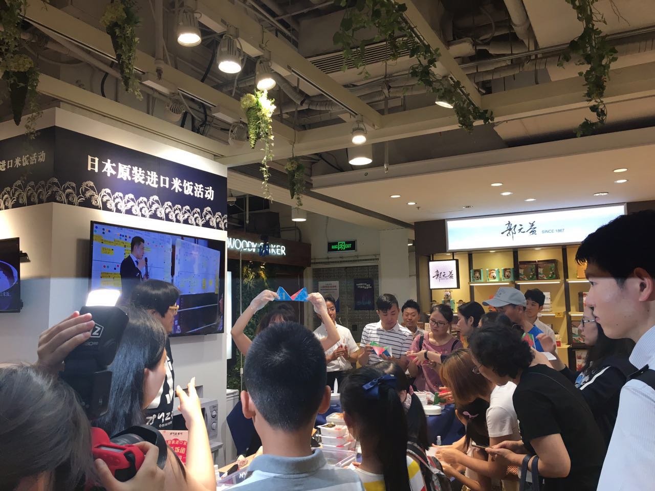 为此他们也把与日本米制品文化相关的趣味元素带了进来。比如一家专门为饭团制作外壳的设计公司也来到了日本食材品鉴会,并在上海的伊势丹百货举办折纸饭团活动——设计师带着参与者一起折纸,并教人们如何把微波米饭捏成可爱的饭团。包裹成富士山形状的折纸饭团颇受孩子们喜爱,当场吸引了不少家庭参加。负责人表示这些折纸还不打算在中国贩卖,但它们却为普通的日本米试吃增加了不少噱头和趣味。
