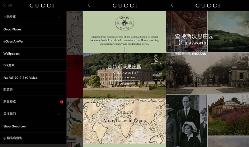 这是意大利时装品牌GUCCI在手机APP中最新上线的旅行功能,第一站它带你去的这个查特斯沃思庄园,是自家品牌2017早春系列广告片的拍摄取景地。