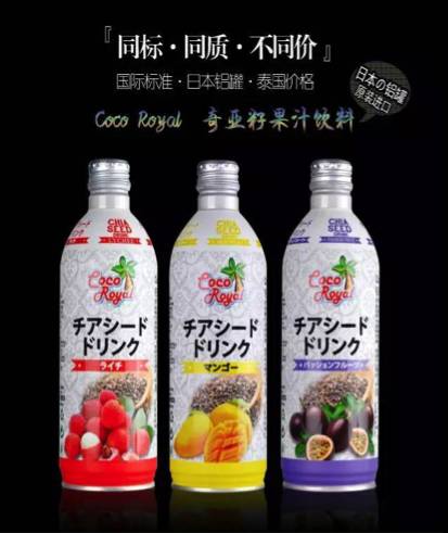 由利物浦进出口公司引进的Nit@奇亚籽饮料在进入大陆市场后热卖一片,该饮料每瓶富含30%(约90克)的奇亚籽以及Omega 3脂肪酸、膳食纤维、天然抗氧化物和矿物质等元素,天然健康。同时,韩国饮料公司Mega Chia也推出了一款奇亚籽复合果汁,将奇亚籽与6种果蔬混合,使之具备了脂肪酸和膳食纤维。[8]