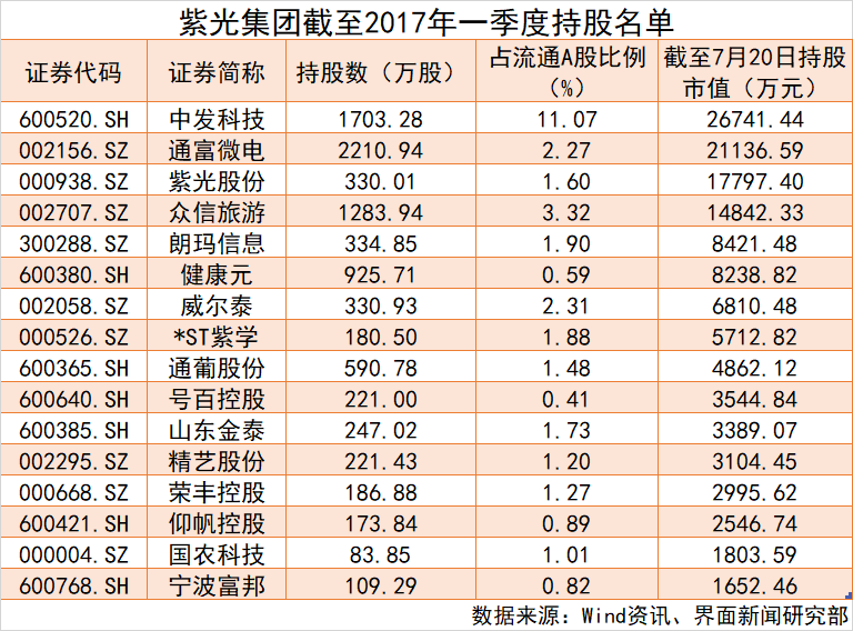 在紫光集团目前的持股名单中,其对中发科技的投入成本最高。截至今年3月底,紫光集团持有中发科技股票约170.28万股,持股市值达2.67亿元。