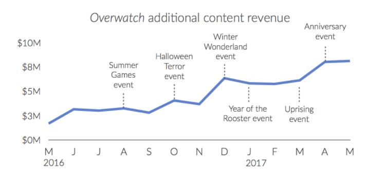 大公司和独立开发者们正努力迎合这种趋势,比如《守望先锋》,这款推出后已经有一年多的游戏依然挣钱,不仅仅是指它的注册玩家数量刚刚超过了2500万,常态化的游戏活动和更新同样激发了玩家的消费欲,SuperData统计发现,诸如夏季活动、万圣活动和圣诞活动很好地让游戏保持了活跃度,再加上限时游戏奖励刺激,许多玩家不惜一掷千金,导致游戏营收一路走高。