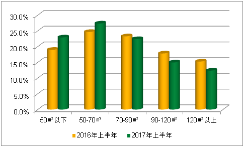 受益于低总价,小户型依然是市场上的“快销品”,而且需求出现大幅倾斜。上海链家数据显示,在今年上半年成交房源中,面积在90平方米以下的占比72.67%,总价在300万以下的占比64.75%。与2016年上半年相比,50平方米以下和50-70平方米面积段的房源成交比重分别增长了3.94%、2.69%,成交比重均有较为明显的上升。相反,70-90平方米房源有小幅下滑,90-120平方米及120平方米以上面积段的成交比重均有较大幅度下降。