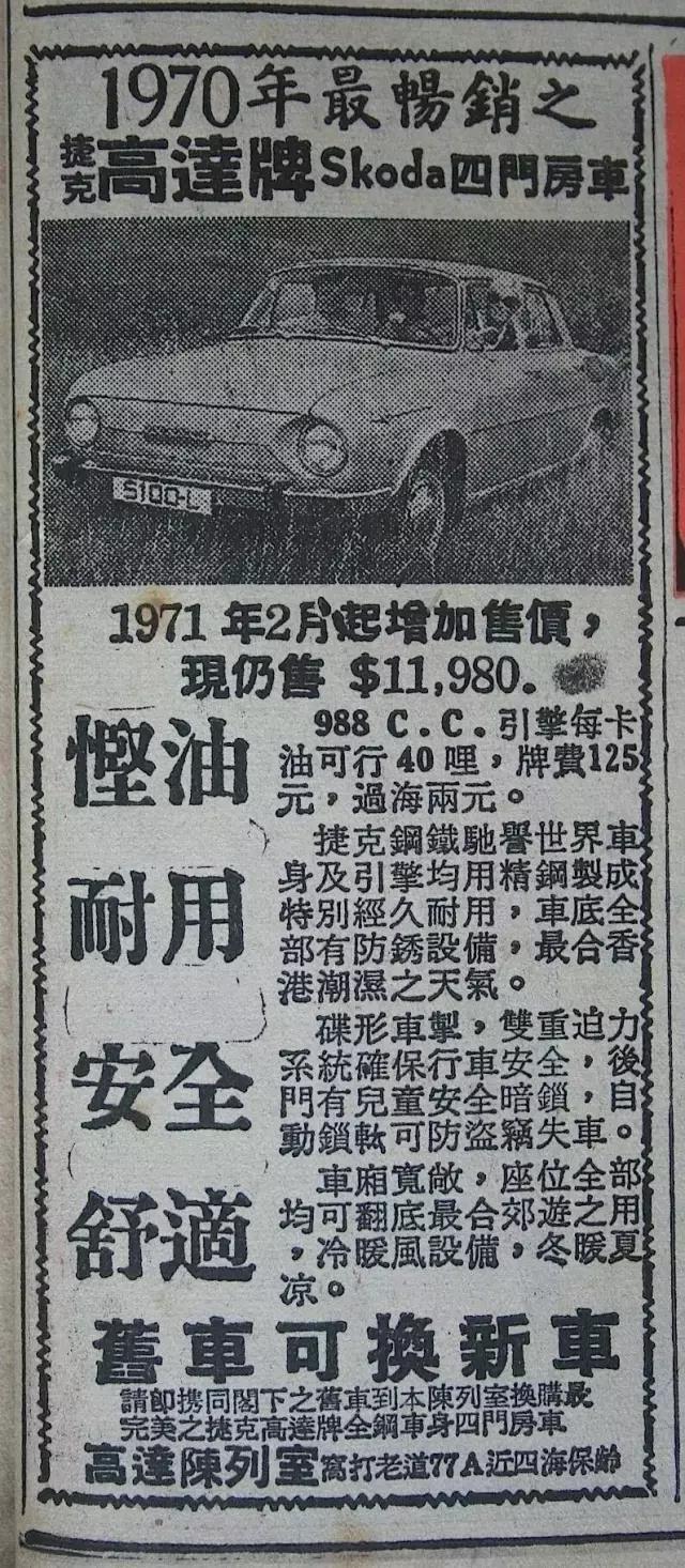 这个时候捷克的Skoda也进口到香港,1.198万港币的售价普通人工作两年也买得起了。不过这款车的排量只有1.0L,但是一卡油(加仑)可以行驶40哩,换算过来油耗7L/100公里,在那个年代也确实算很省油了。现在大众宣传的德国工艺特质钢板、防腐防锈材质在70年代的广告上就已经出现了,这么多年一直作为大众车的卖点在宣传中使用。
