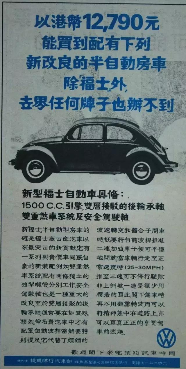大众在香港被称为“福士”,通过这篇宣传广告可以看到大众当年对自家产品有多自信。1.279港币就能买到自动挡车型并且配备了豪华车才有的配置,当别的车型还在配备手动挡的时候,大众已经用上了三档的自动变速箱,并且价格还很实惠。不然怎敢放言“除了福士外,世界任何牌子也办不到”,现在的大众怎么没有了当初的魄力。