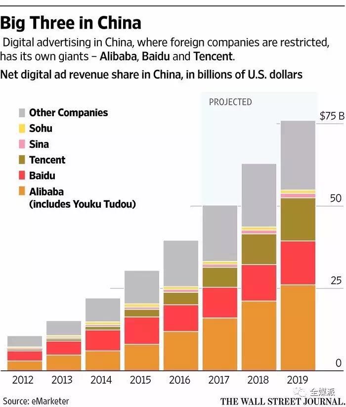 传统快消巨头放弃烧钱式广告投放的同时,中国本土公司——尤以互联网巨头为代表,却打响了品牌声量争夺战。据市场研究公司eMarketer于今年6月发布的报告称,2017年中国数字广告的市场规模将达500亿美元,而BAT将占据其中62%之多。