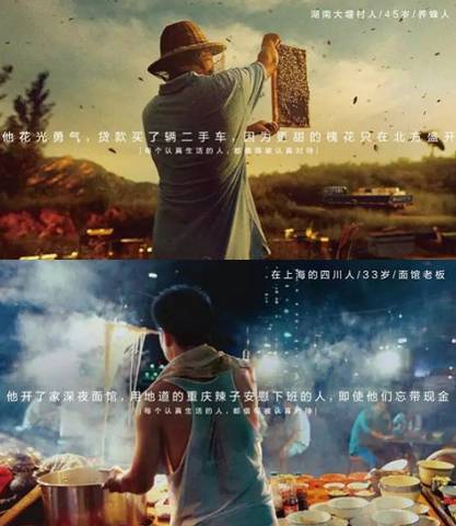 蚂蚁金服在一组品牌海报中,就通过讲故事的方式,勾勒出一群形象各异的用户形象,45岁的养蜂人、33岁的面馆老板,文案通过“更甜的槐花”、“地道的重庆辣子”等细节文案,让人物形象和故事变得真实起来。