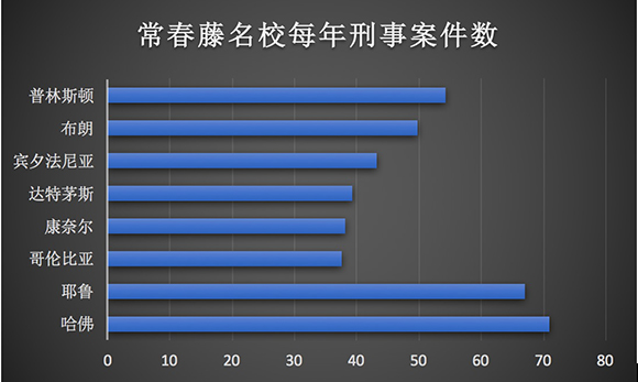 美国教育部公布的数据显示,包括哈佛和耶鲁在内的八所常春藤大学,各所学校平均每年发生刑事案件50起。其中哈佛大学数量最高,达到平均每年71起。